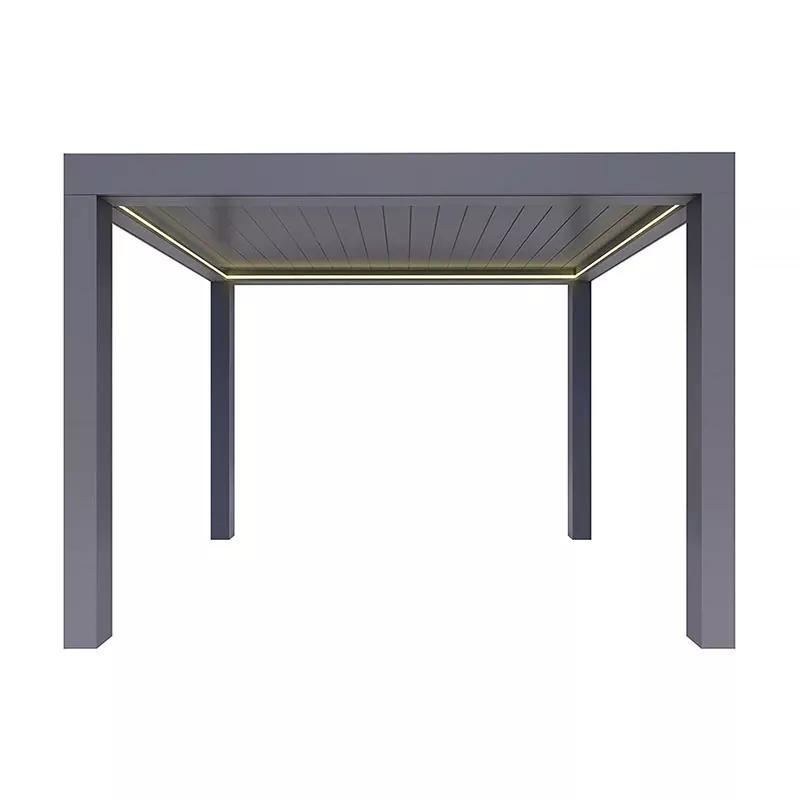 La pergola bioclimatica di Vionta è dotata di lamelle orientabili da 0° a 140°, che consentono di regolare il livello di ombreggiatura in base all'angolo di luce solare durante il giorno.