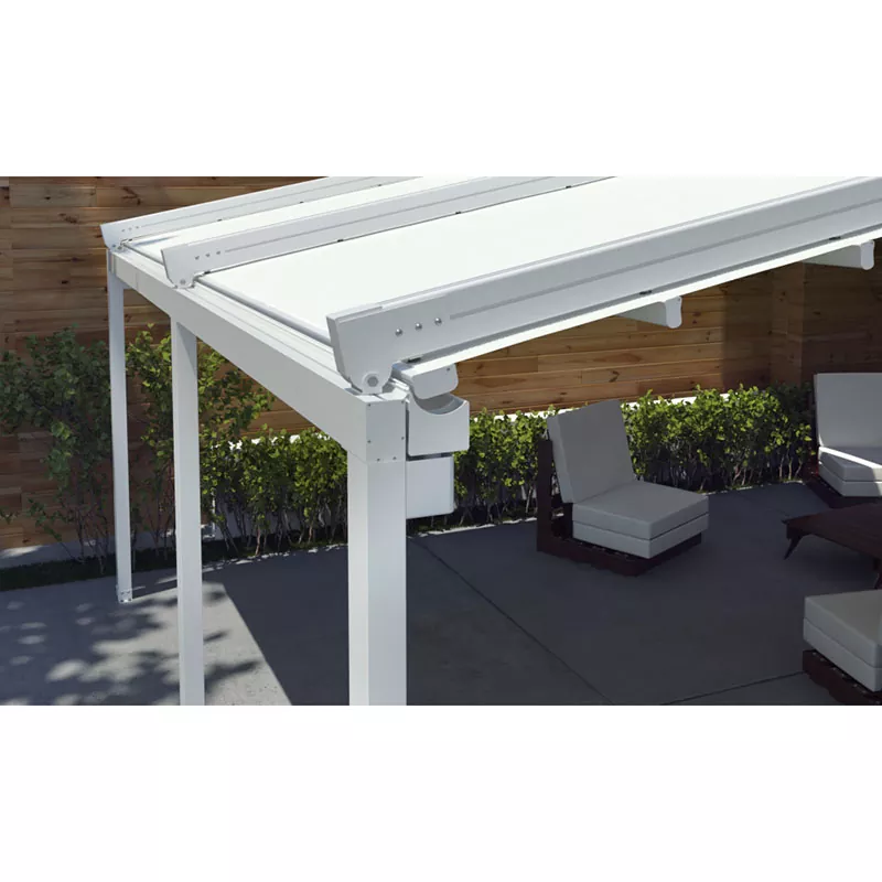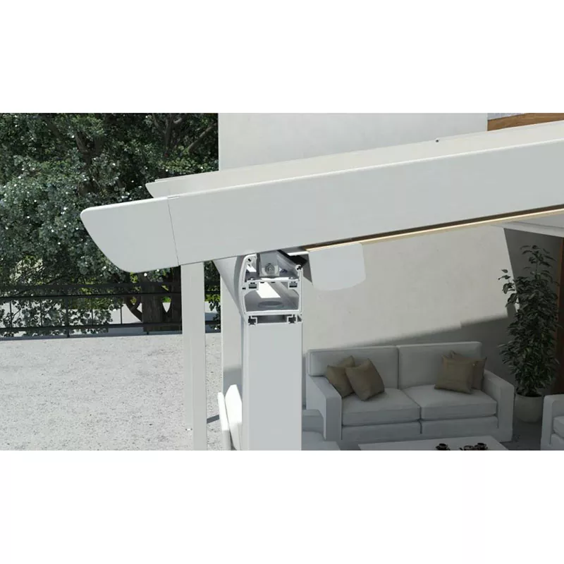 Pergola retrattile elettrica di fascia alta con struttura in alluminio, Pergola Roof offre sistemi durevoli ed estetici per utilizzare il patio, la terrazza e il cortile tutto l'anno. È a tenuta stagna con grondaia incorporata ed è dotata di illuminazione a LED incorporata.