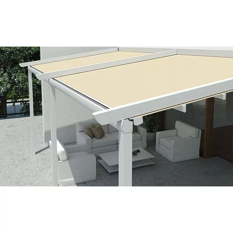 Pergola Retrattile Elettrica, progettata esclusivamente da Vionta per offrire alte prestazioni e durata. Con profilo guida da 120 x 70 mm e rivestimento in PVC, garantisce una lunghezza di proiezione fino a 6 metri, coprendo comodamente ampie aree.