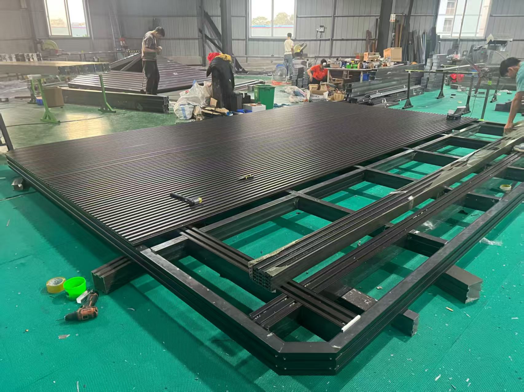 Sul pavimento dell'officina i telai della pergola vengono prima assemblati in sezioni. Appoggiamo la struttura in piano per rendere l'allineamento più facile da controllare. Ciò aiuta a garantire che ogni punto di connessione si adatti correttamente e che le dimensioni complessive rimangano precise.