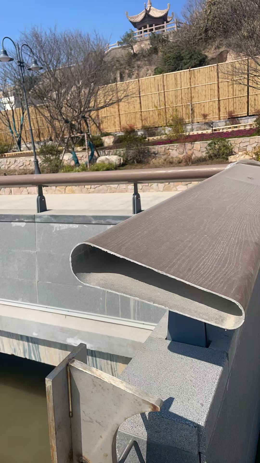 Il progetto utilizza materiale in lega di alluminio e ottiene un effetto visivo vicino al legno naturale attraverso la tecnologia di trasferimento delle venature del legno. Rispetto ai tradizionali corrimano in legno massiccio, la lega di alluminio offre una resistenza alla corrosione superiore e una maggiore durata, rendendola particolarmente adatta per ambienti costieri ad alta salinità.