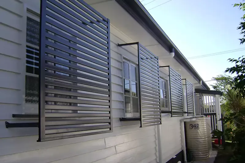Lame metalliche angolate per un'ombreggiatura efficace Progettato per la privacy e il controllo solare Disponibile nelle opzioni fisse o regolabili |